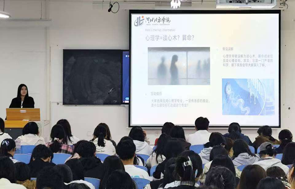 在经验分享环节,四位优秀学生代表倾囊相授,分别从实践探索、创新挑战、学业规划等角度,为新生解锁成长密码。历史学专业、学院团委学生副书记张康同学以“在实践中成长”为主题,不仅分享了组织、参与暑期“三下乡”活动、特殊儿童学校支教等团学实践经历,还系统总结了从项目策划、团队协作到成果转化的宝贵经验。学前教育专业、学院学生会主席丁潞涵聚焦“创新与挑战”,系统梳理了挑战杯、大学生创新创业等赛事、项目的申报流程,鼓励新生积极尝试,将专业所学转化为创新成果。应用心理学专业、国家奖学金获得者曹嘉朦从“高效学习与自我管理”角度出发,分享了专业课程学习、时间规划、职业生涯规划与备考策略等成长经验,帮助新生筑牢学业基础。应用心理学专业、学院自律会负责人银琪以“守正致远,助梦启航”为主题展开分享。她首先从宿舍管理、课堂考勤等日常规范入手,阐释“守正”之要;随后详细梳理了奖助学金的评定与申请政策,助力学子梦想启航。分享环节后,现场通过视频展示了学院学科竞赛与文体活动的精彩瞬间。互动答疑阶段,新生踊跃提问,学长学姐结合实例耐心解答,现场气氛热烈。